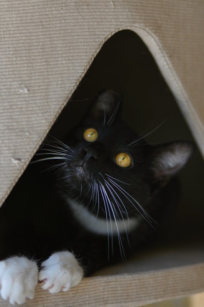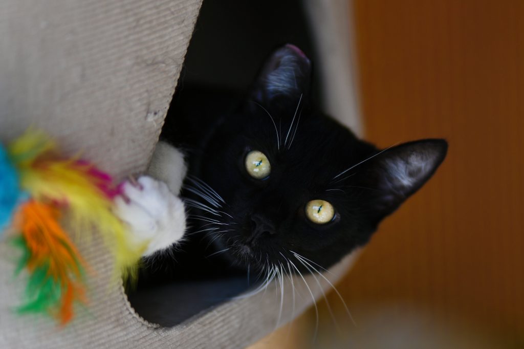 Lange hält er das aber nicht durch, dann siegt die Neugier und verschmitzt lässt er sich auf ein Spielchen ein.