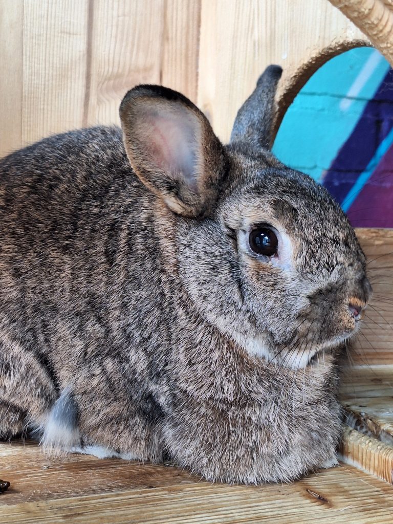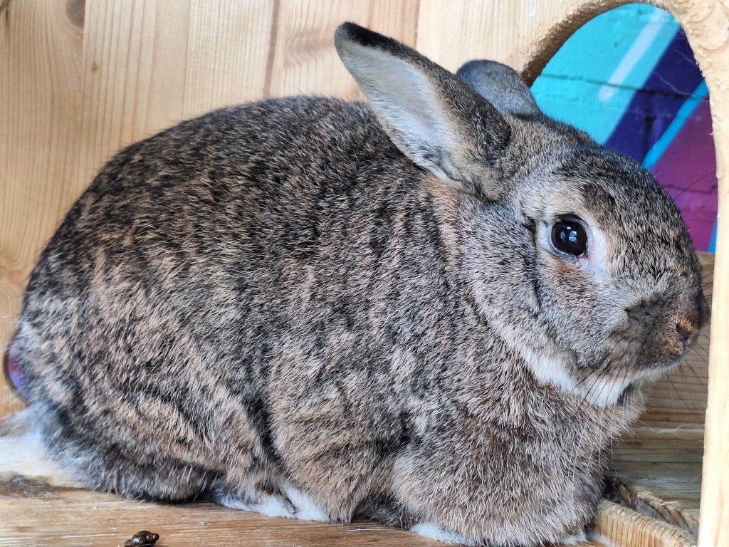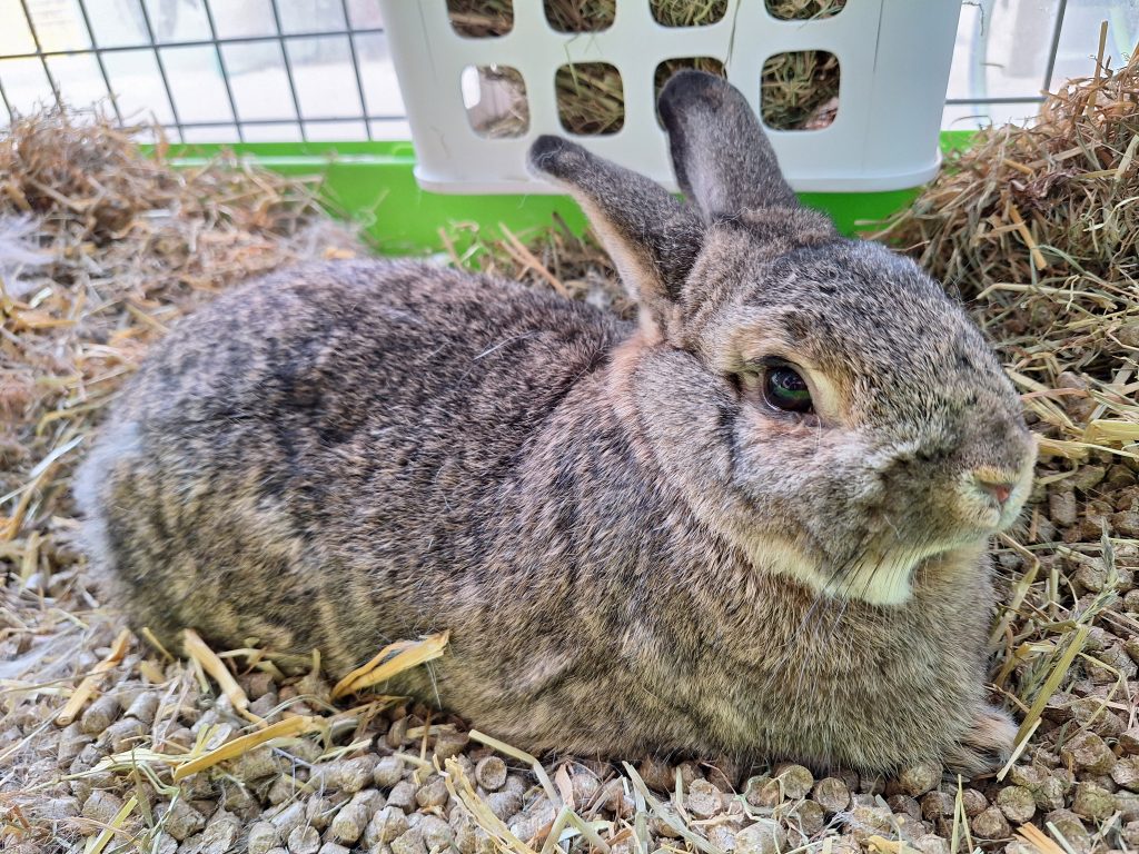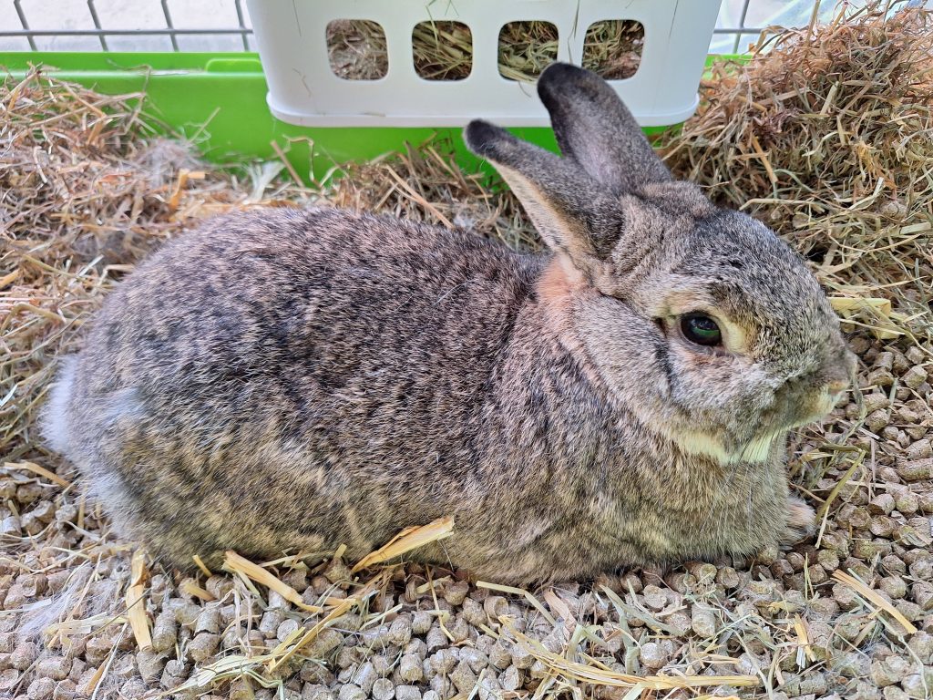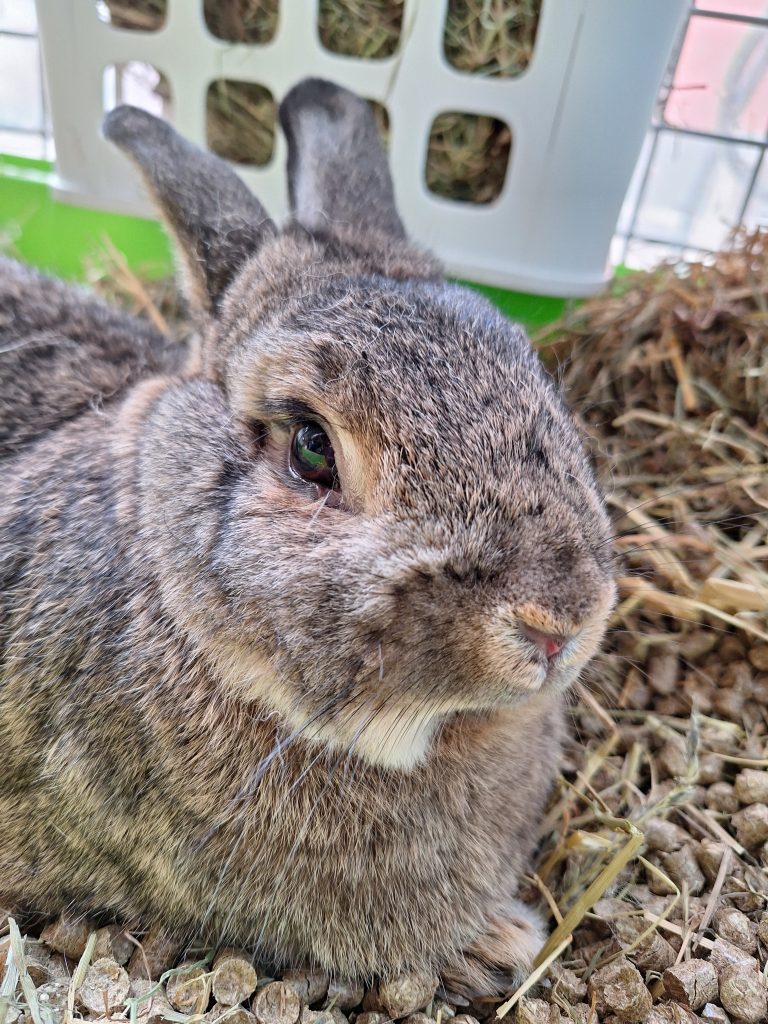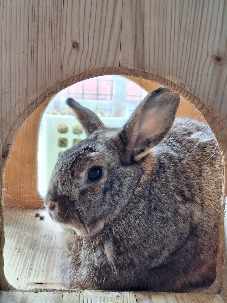 Rudibert lief mit mehreren anderen Kaninchen draußen herum und wurde daraufhin eingefangen. Ob er ausgesetzt wurde oder ausgebrochen ist wissen wir leider nicht. Rudibert ist ein sehr ruhiges und sensibles Kaninchen. Große Aufregung und Konflikte sind überhaupt nicht sein Ding. Er zieht sich dann lieber zurück und lässt anderen den Vortritt. Bei uns lebt er in einer gemischten Gruppe im Außengehege und ist bisher noch nicht sehr erfreut über die reine weibliche Gesellschaft. Das mag aber auch an den dominanten Charakteren liegen. Scheinbar braucht Rudibert eine ruhige Dame an seiner Seite. Von dominanten Weibchen lässt er sich schnell einschüchtern.