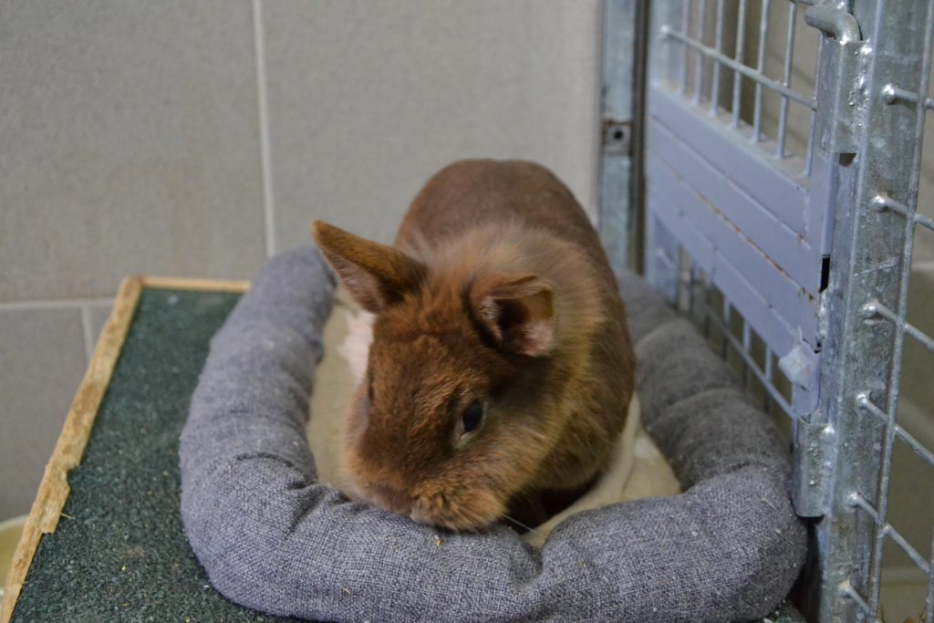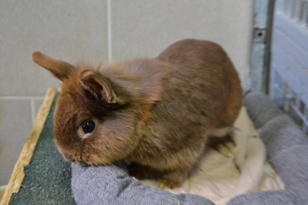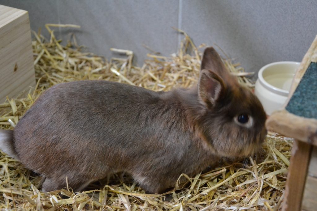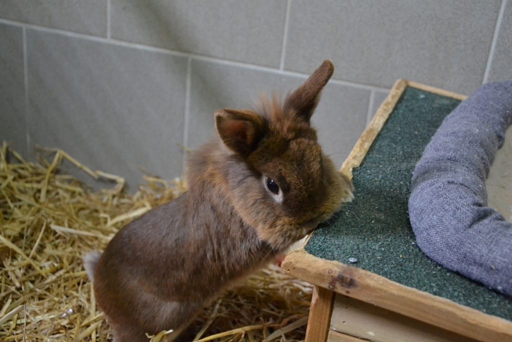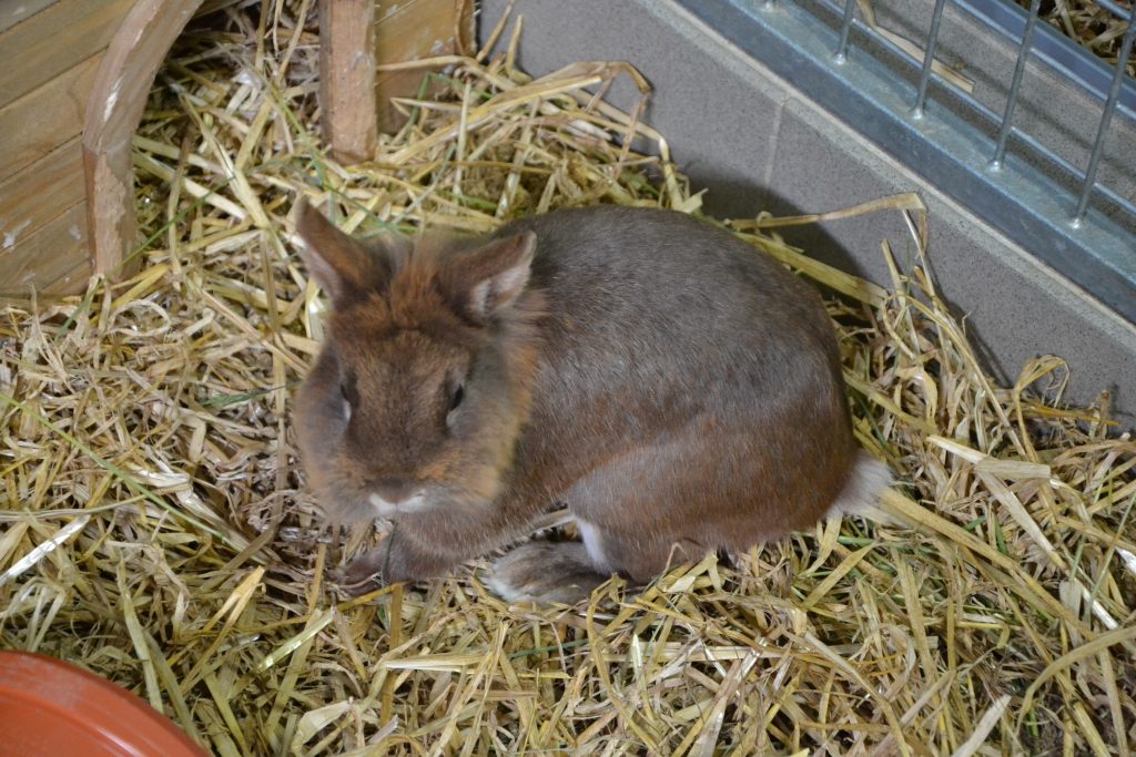 Vor Menschen hat er jedoch anfangs ein bisschen Angst und braucht eine Weile, um Vertrauen zu fassen. Zu schnelle Bewegungen erschrecken ihn, sodass er ängstlich wegrennt. Er ist aber sehr neugierig und kommt stets angehoppelt, um zumindest an uns Menschen zu schnuppern.