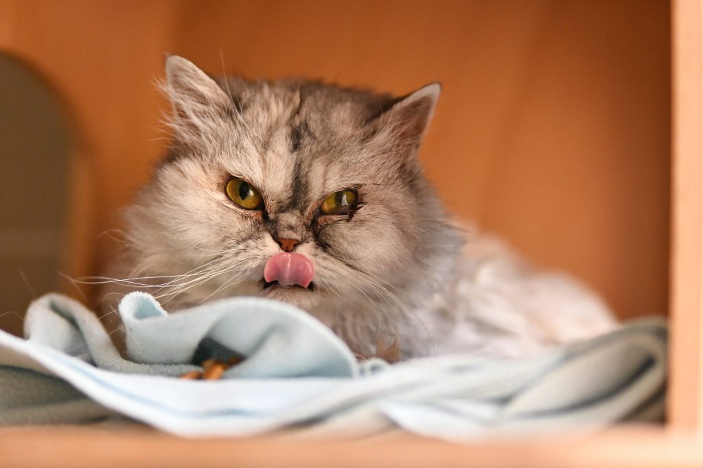 Edith fehlt das linke Vorderbein und ihre Nierenfunktion ist eingeschränkt, daher benötigt sie Spezialfutter.