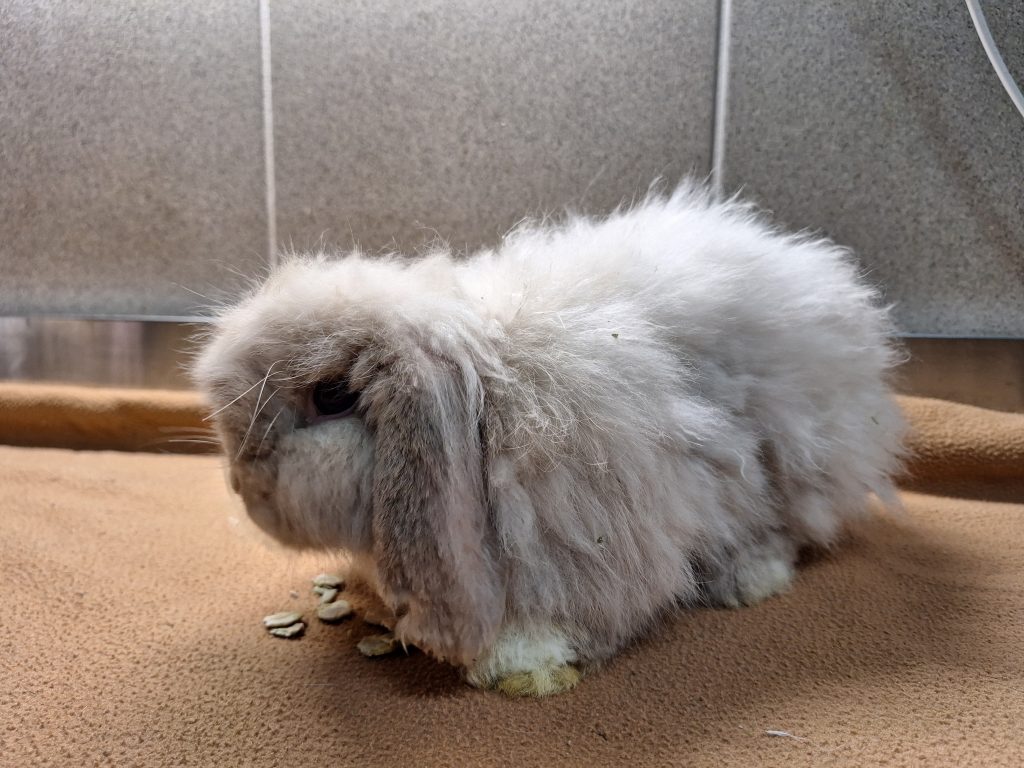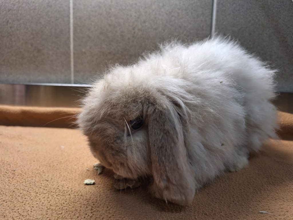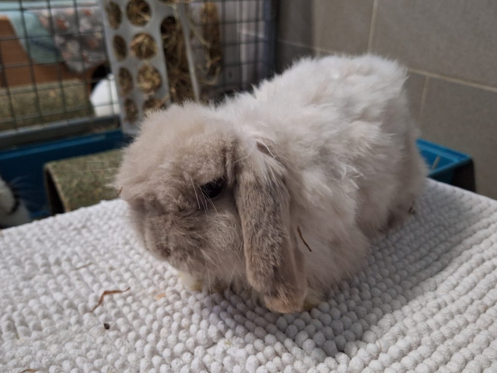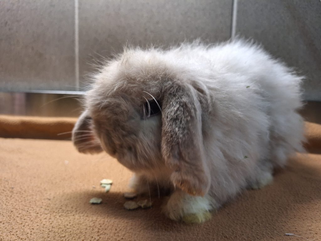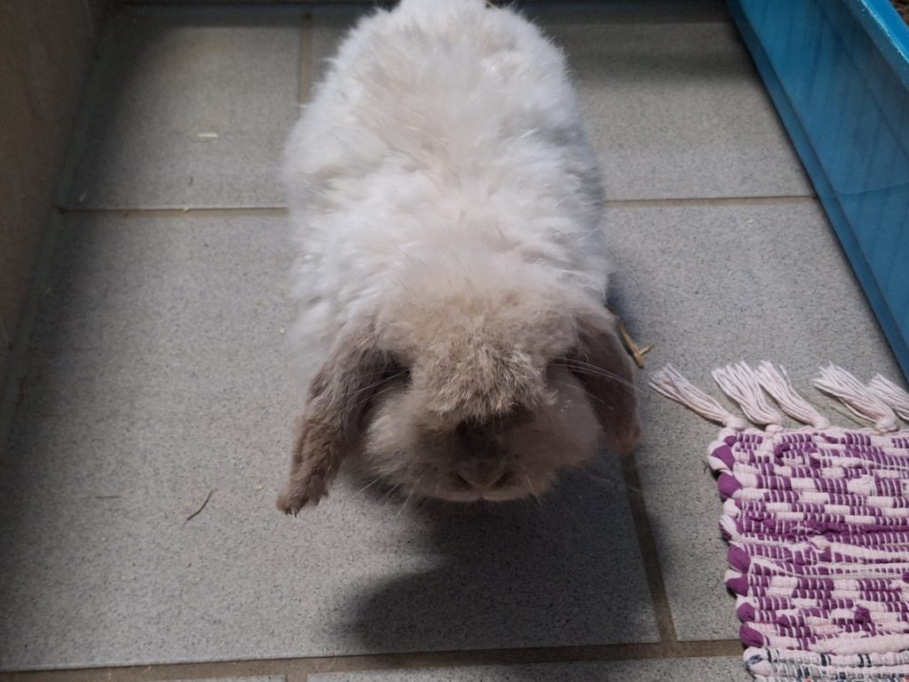 Der arme Kerl hatte es von Anfang an schwer. An seinem anfangs schlechten Zustand ist leider auch der unglücklich gewählte Mix seiner Rassen schuld. Als würde es nicht reichen, dass er schon ein Widder ist. Mit den Schlappohren wird er noch genug Probleme bekommen. Zu allem Überfluss ist er als Teddykaninchen auch noch eine Langhaarrasse. Eul-Erich muss man ehrlicherweise durch und durch als Qualzucht bezeichnen und wir weisen an dieser Stelle deutlich darauf hin, dass dieses Tier ein Leben lang mit den Rassemerkmalen zu kämpfen haben wird. Bezüglich seiner Ohren muss man sich der Problematik der Widderkaninchen bewusst sein, hier müssen mindestens jährliche Kontrollen stattfinden. Sein Fell benötigt besondere Pflege, er muss mehrmals wöchentlich gekämmt werden und am besten sollte das Fell kurz gehalten werden. Er neigt sonst zu Verfilzungen, zudem verfängt sich alles mögliche an Dreck und Einstreu in seinem Fell und auch Urin und Kot verfängt sich, was einfach unhygienisch für den kleinen Mann ist. Leider hasst er es, gebürstet und rasiert zu werden. Es ist ihm zu nervig, er ist schnell frustriert und reagiert dann mit Zwicken. Wir haben ihn auf eine gute Länge rasiert bekommen, das erleichtert das kämmen und Eul-Erich muss die Prozedur nicht lange über sich ergehen lassen. Dieser Pflegeaufwand muss einem bewusst sein. Im Sommer würden wir zu einer noch kürzeren Frisur raten, da es sonst zu warm wird. Reine Außenhaltung wäre aufgrund des Fells nicht zu empfehlen, da es hier zu sehr verschmutzen könnte.