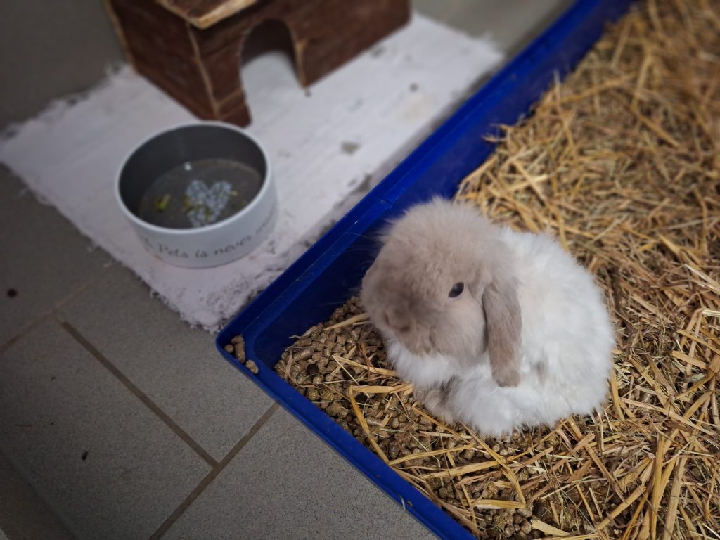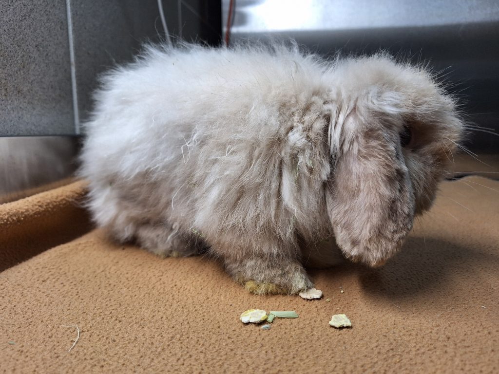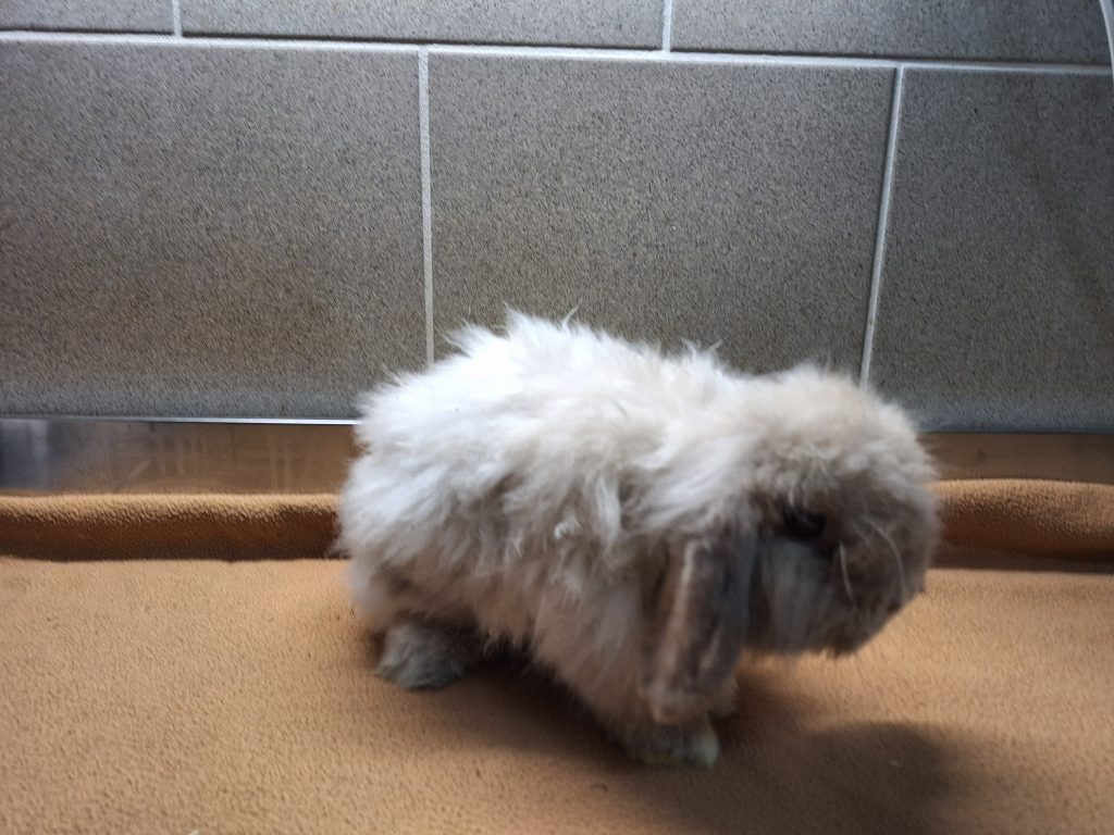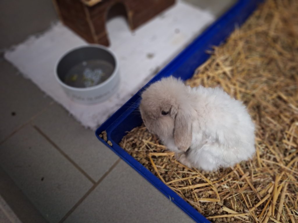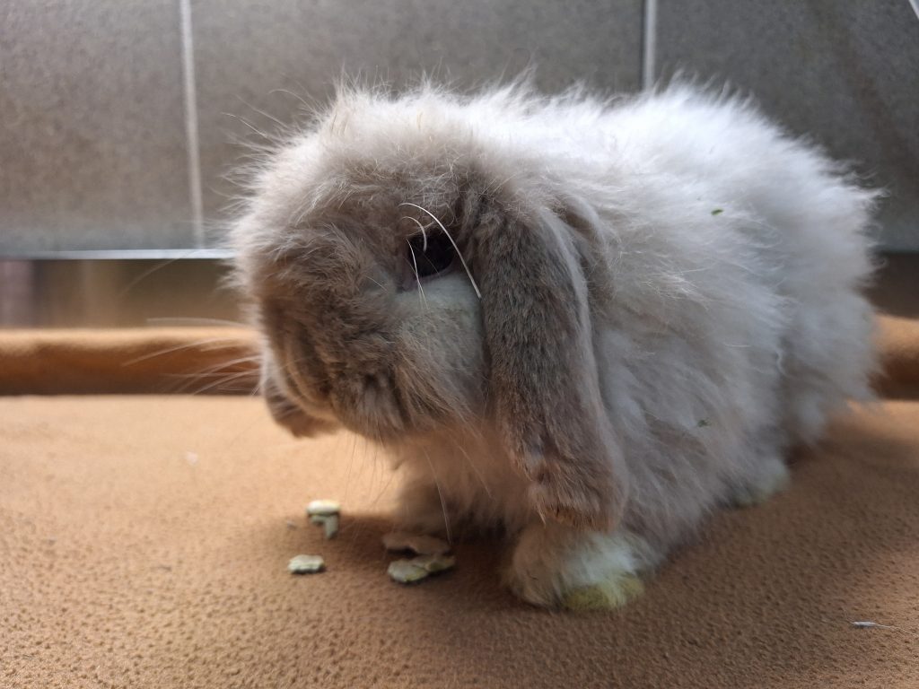 Der arme Kerl hatte es von Anfang an schwer. An seinem anfangs schlechten Zustand ist leider auch der unglücklich gewählte Mix seiner Rassen schuld. Als würde es nicht reichen, dass er schon ein Widder ist. Mit den Schlappohren wird er noch genug Probleme bekommen. Zu allem Überfluss ist er als Teddykaninchen auch noch eine Langhaarrasse. Eul-Erich muss man ehrlicherweise durch und durch als Qualzucht bezeichnen und wir weisen an dieser Stelle deutlich darauf hin, dass dieses Tier ein Leben lang mit den Rassemerkmalen zu kämpfen haben wird. Bezüglich seiner Ohren muss man sich der Problematik der Widderkaninchen bewusst sein, hier müssen mindestens jährliche Kontrollen stattfinden. Sein Fell benötigt besondere Pflege, er muss mehrmals wöchentlich gekämmt werden und am besten sollte das Fell kurz gehalten werden. Er neigt sonst zu Verfilzungen, zudem verfängt sich alles mögliche an Dreck und Einstreu in seinem Fell und auch Urin und Kot verfängt sich, was einfach unhygienisch für den kleinen Mann ist. Leider hasst er es, gebürstet und rasiert zu werden. Es ist ihm zu nervig, er ist schnell frustriert und reagiert dann mit Zwicken. Wir haben ihn auf eine gute Länge rasiert bekommen, das erleichtert das kämmen und Eul-Erich muss die Prozedur nicht lange über sich ergehen lassen. Dieser Pflegeaufwand muss einem bewusst sein. Im Sommer würden wir zu einer noch kürzeren Frisur raten, da es sonst zu warm wird. Reine Außenhaltung wäre aufgrund des Fells nicht zu empfehlen, da es hier zu sehr verschmutzen könnte.