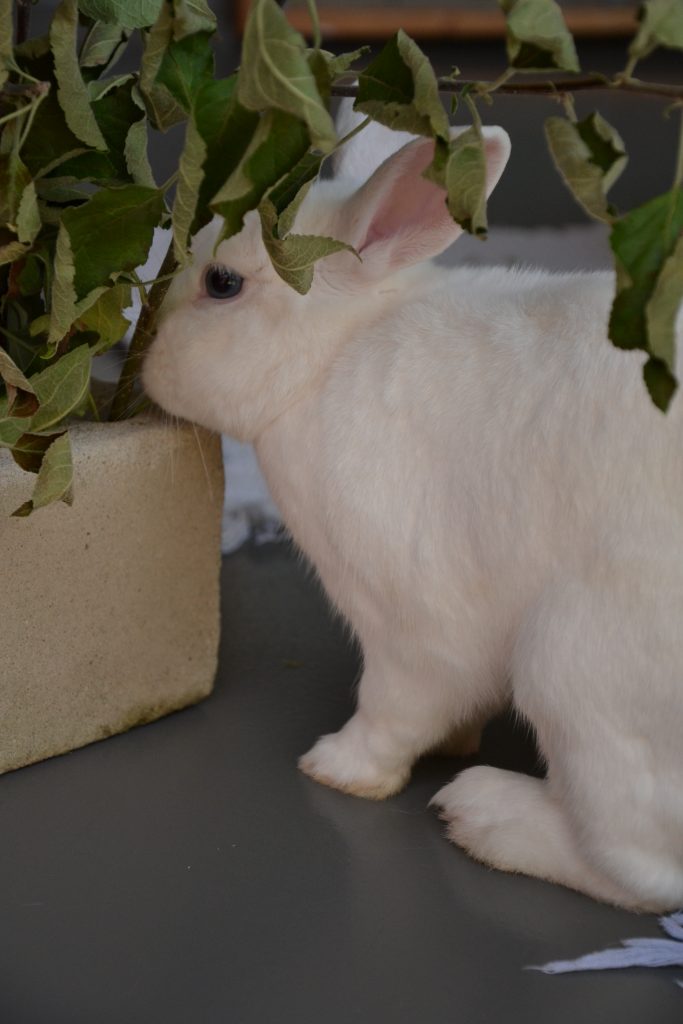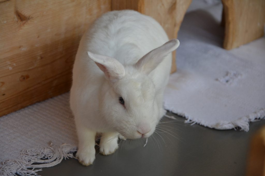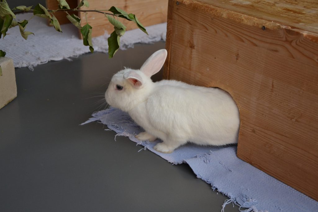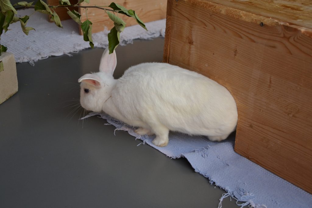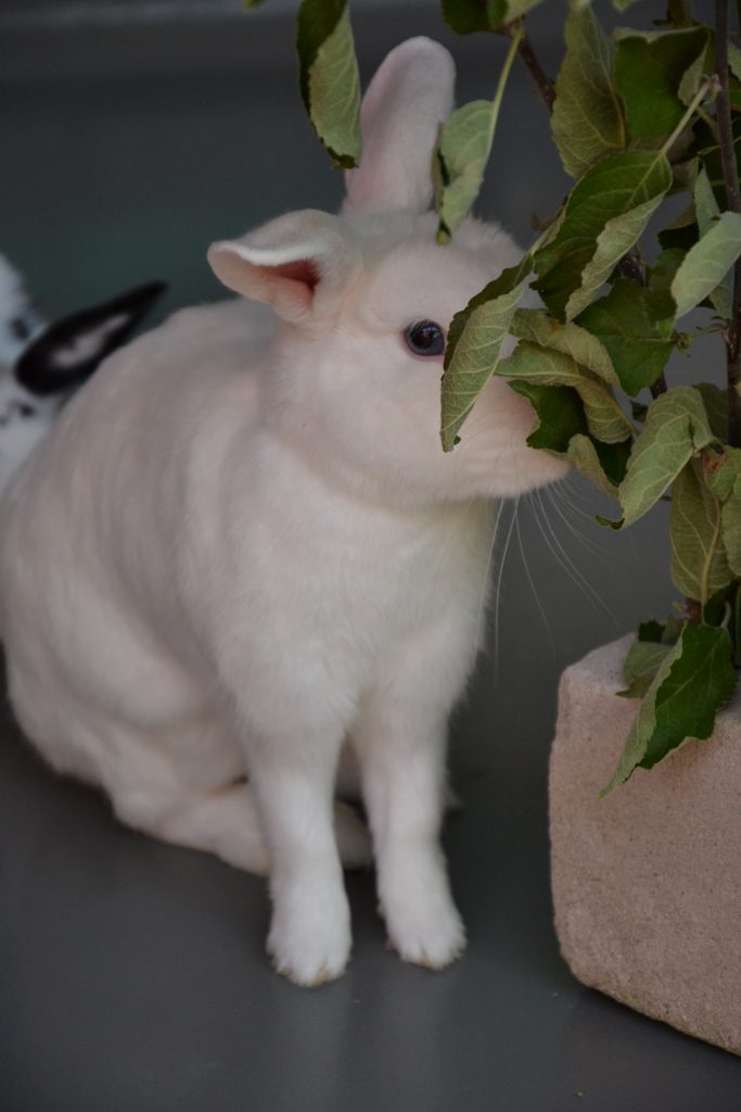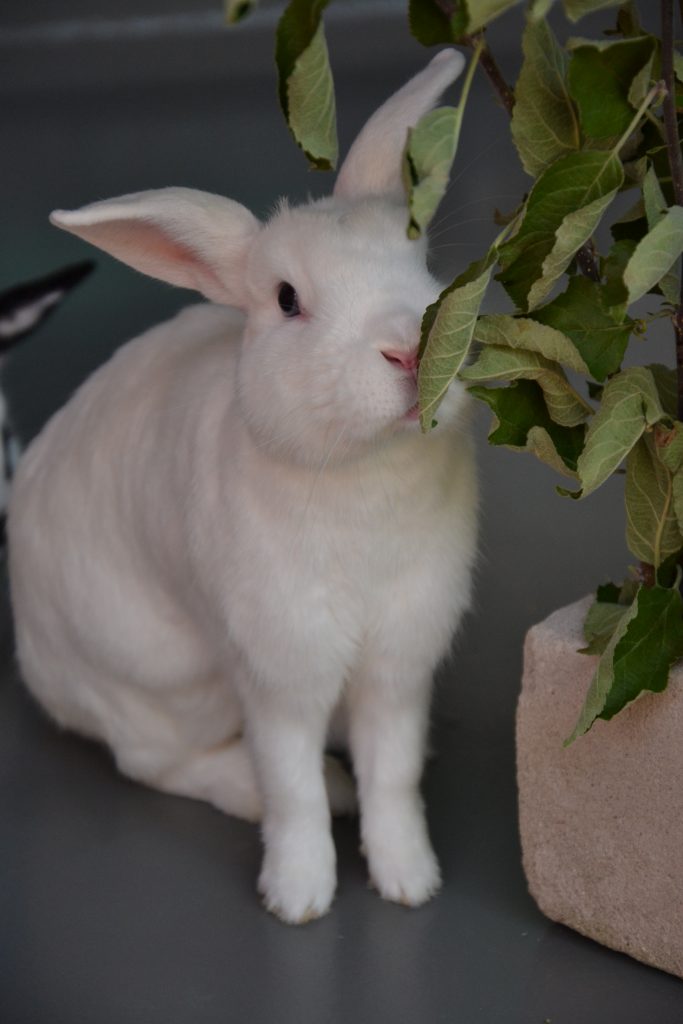 Indigo lebt bei uns mit den anderen Kaninchen in einer großen Gruppe, was gut klappt.