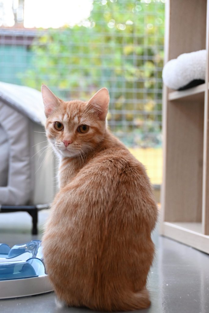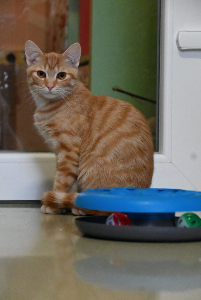 Kylian (rottiger mit viel weiß) und Declan (heller rottiger) sind die mutigeren der Gruppe. Sie haben Interesse am Menschen und fangen an Streicheleinheiten und Spielsessions zu genießen. Die beiden haben ein ähnliches Energielevel, sodass man sie viel gemeinsam spielen sieht. Daher könnten wir uns gut vorstellen, dass die beiden gemeinsam in ein neues Zuhause ziehen. Sie kennen nur die reine Wohnungshaltung und wären sicher dauerhaft okay damit, hätten aber sicher auch nichts gegen Freigang. Wenn es reine Wohnungshaltung wird, sollte diese allerdings katzengerecht eingerichtet sein und viel Spiel- und Klettermöglichkeiten bieten.