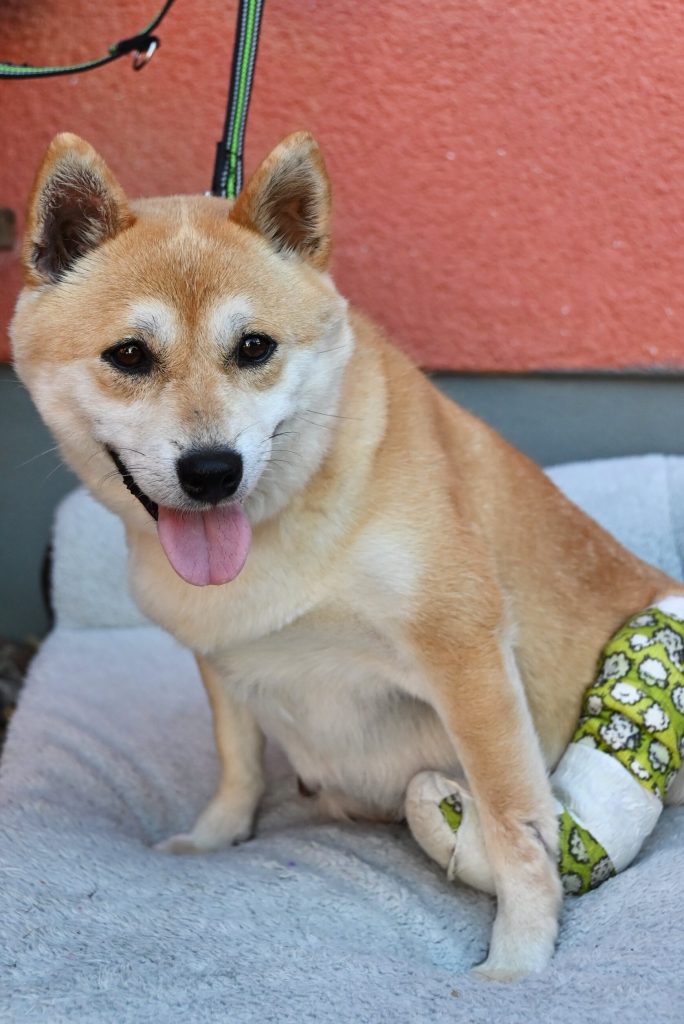 Trotz der Schmerzen schaffte sie es dennoch irgendwann, sich einen Weg in die Freiheit zu bahnen und nahm Reißaus. Als Fundhund kam sie zu uns. Glücklicherweise zeigte sich der Besitzer einsichtig und überließ uns die Shiba Dame, obwohl sie bereits wieder hochtragend war. Eine Operation war jedoch zu diesem Zeitpunkt der Trächtigkeit nicht mehr möglich. Mit Gipsverbänden und Orthesen unterstützten wir so gut wie möglich und tauften sie Miyu.