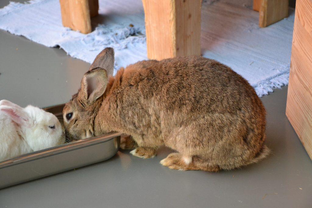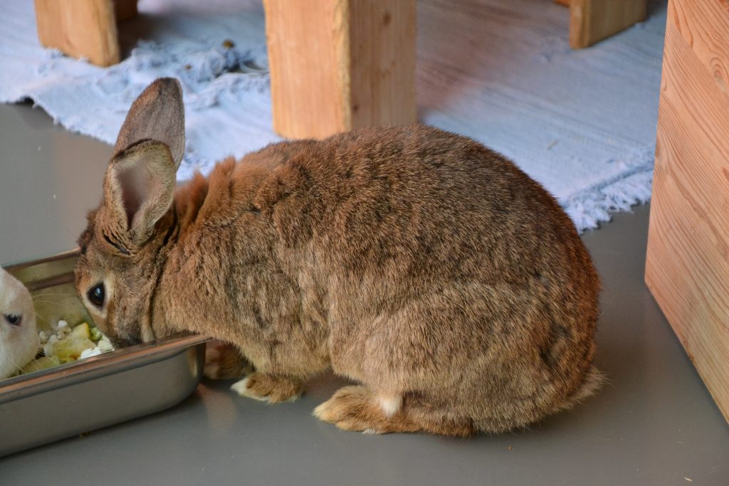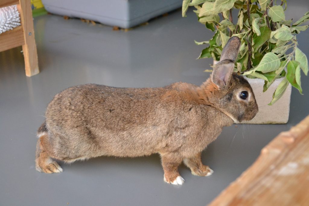 Moni lebt bei uns mit den anderen Kaninchen in einer großen Gruppe, was gut klappt.
