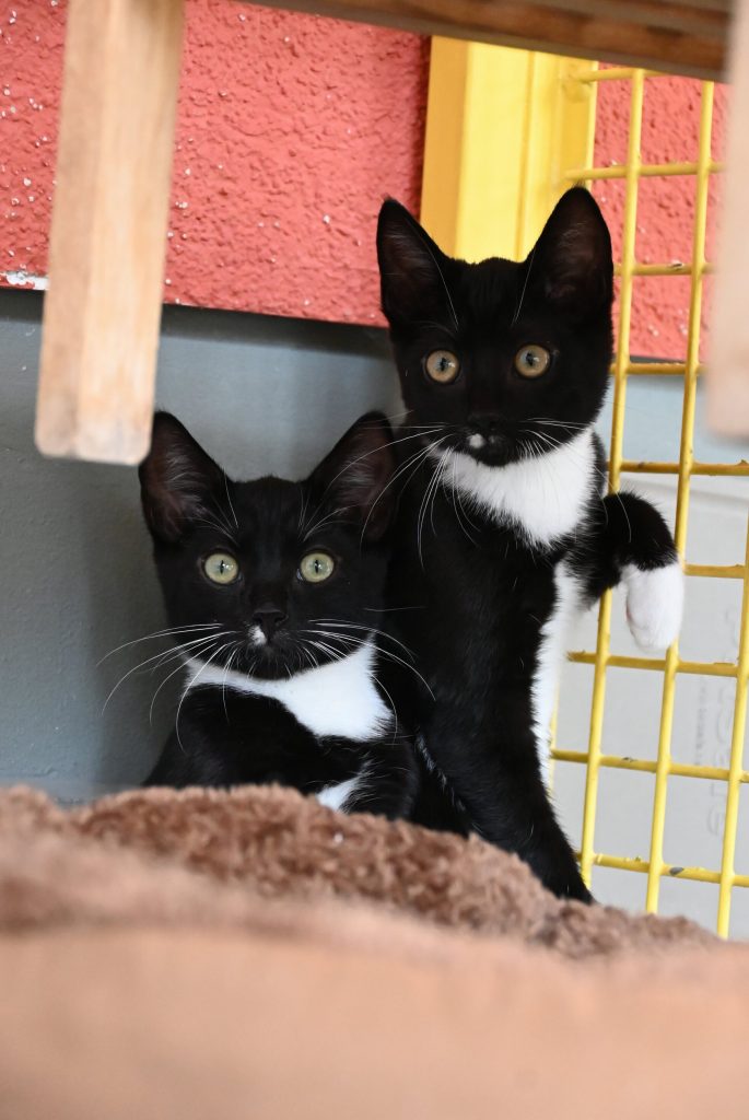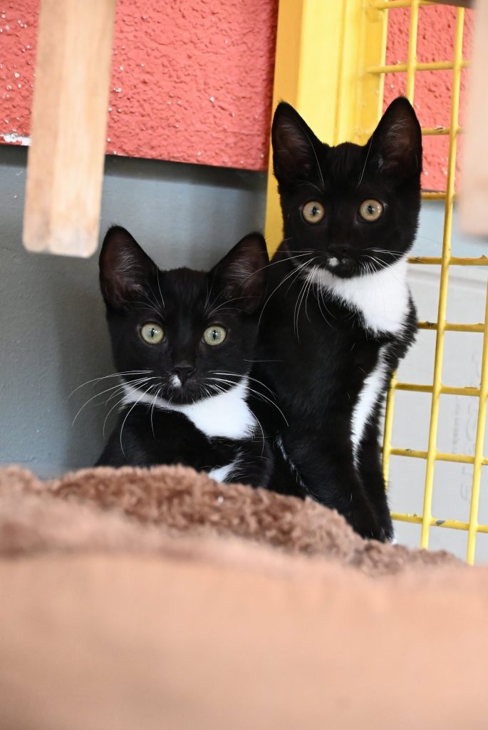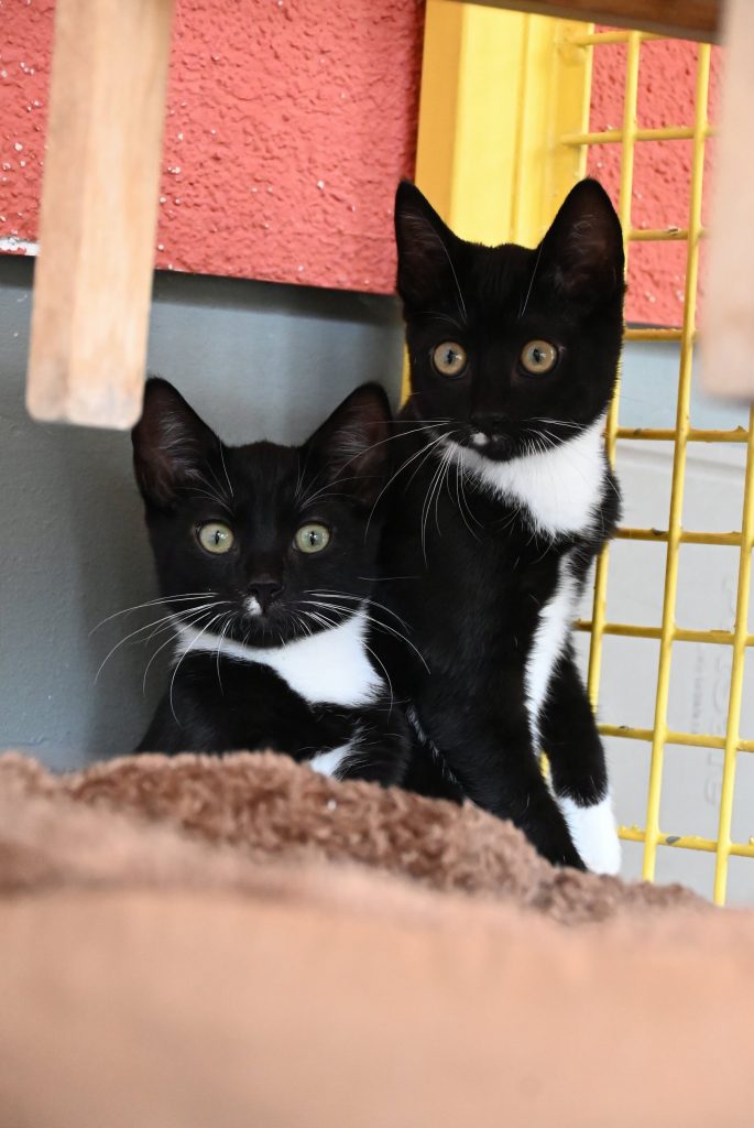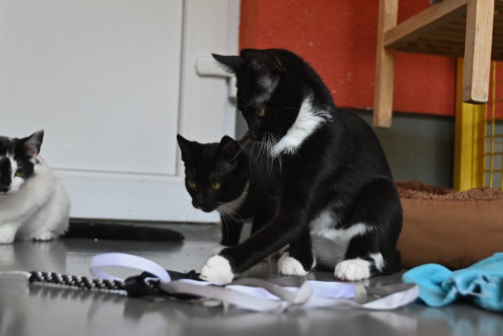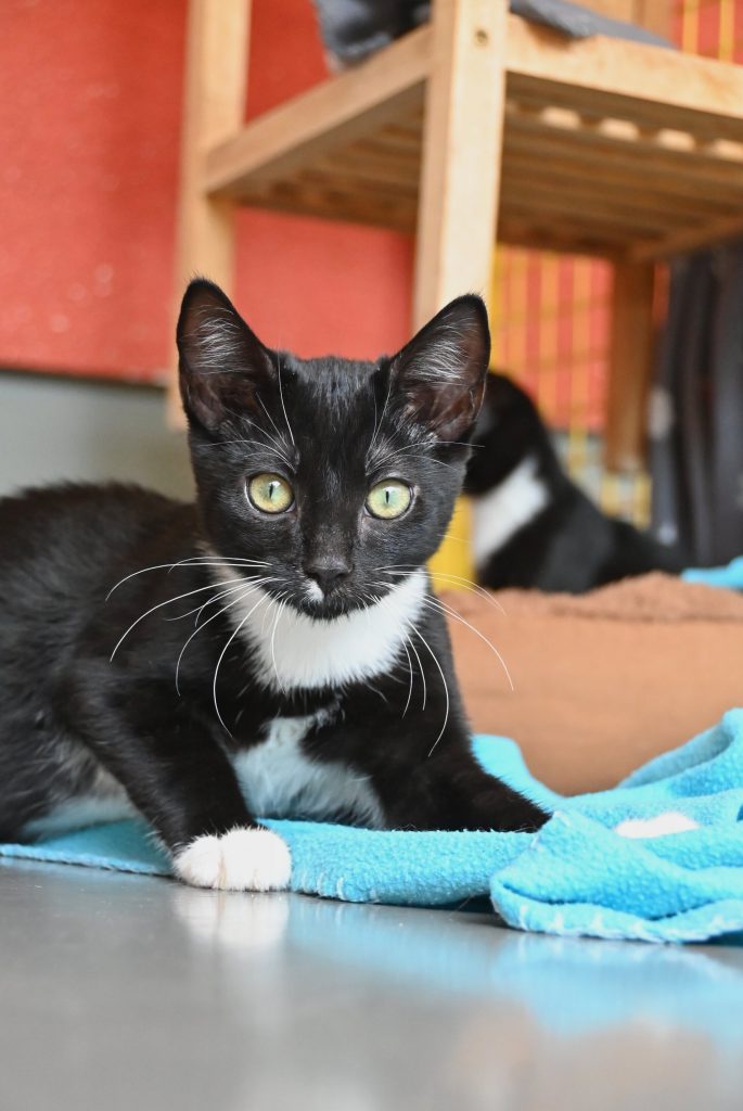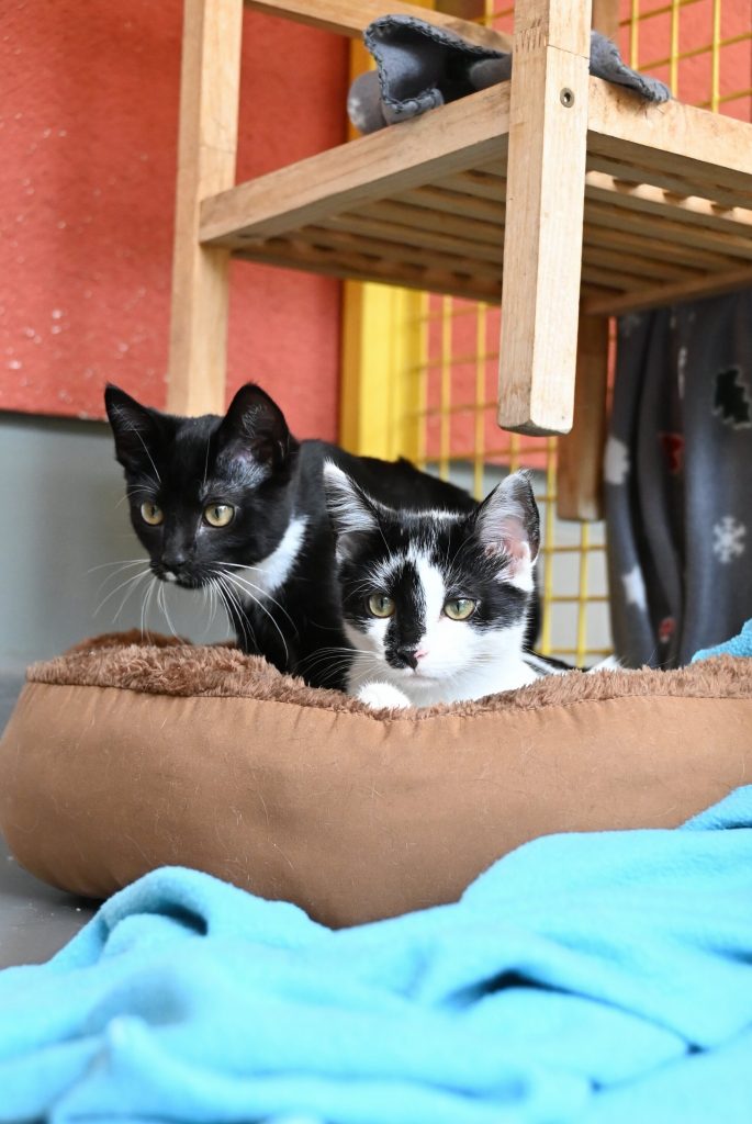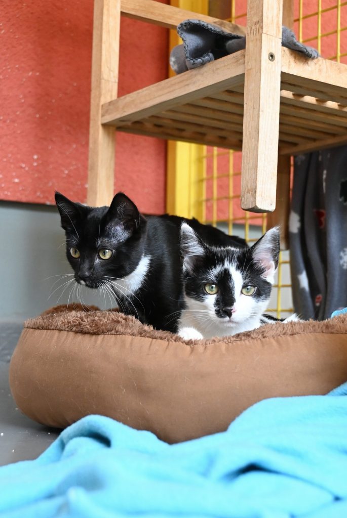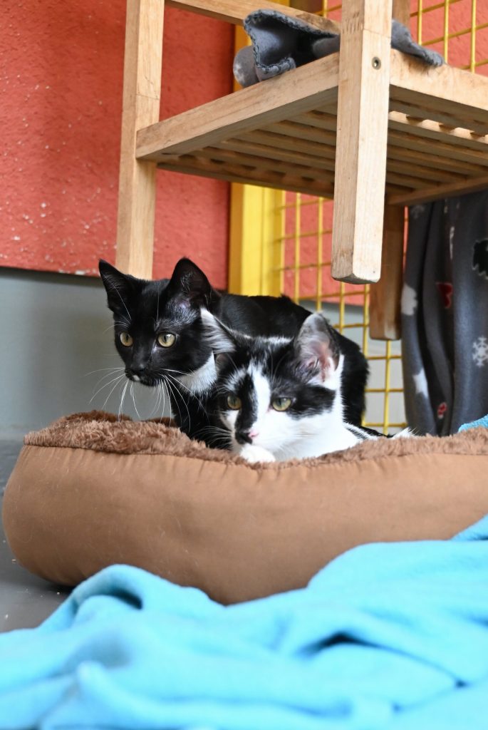 „Ich glaub ich seh doppelt“, das ist der häufigste Gedanke, wenn man das Zimmer der beiden betritt. Sie gleichen sich wirklich sehr. Sowohl optisch, als auch charakterlich. Beide sind etwas zurückhaltend dem Menschen gegenüber und mögen es (noch) nicht so gerne angefasst zu werden. Es wird immer ein kleines bisschen besser, aber das braucht Zeit und Geduld, bis sie Streicheleinheiten irgendwann genießen können. Hier sind Katzenkenner gefragt, die Spaß an einer kleinen Aufgabe haben. Aber man kann sie gut mit Leckerli und Spielzeug bestechen.