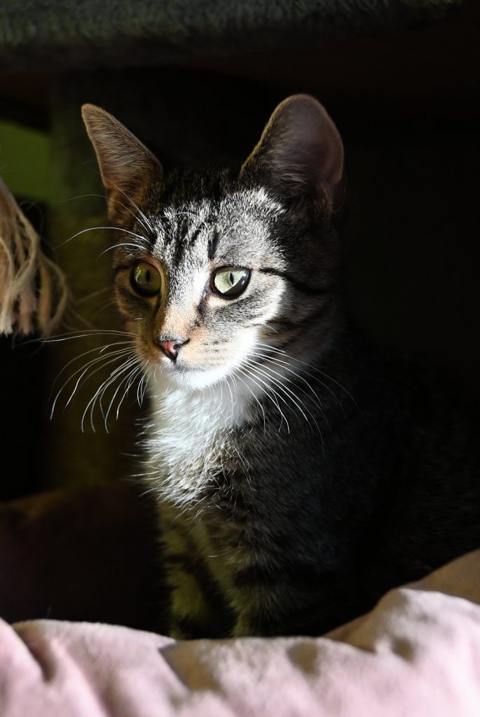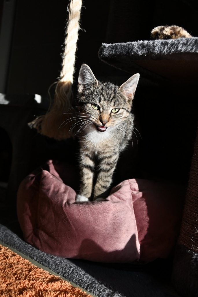 Eigentlich sieht man ihn nur spielen oder schlafen. Aus diesem Grund sollte er nur mit einem Kumpel von uns oder zu einer vorhandenen, gleichalten Katze ziehen.
